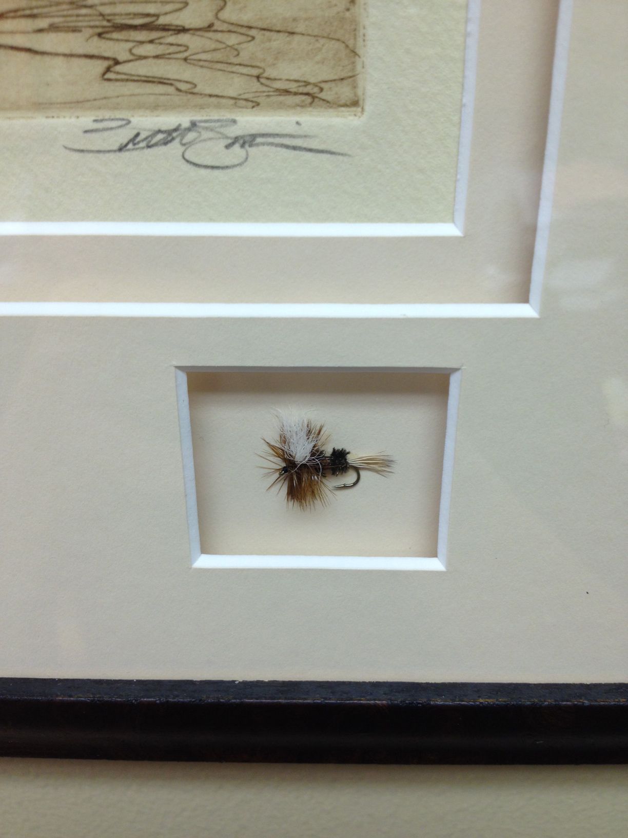 Framed with fly in Walnut Burl with spacer between double mats.